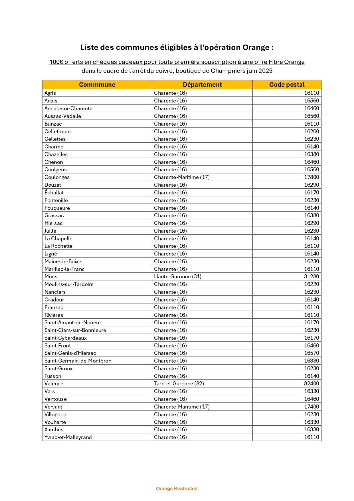(1) 100€ offerts en chèques cadeaux pour toute première souscription à la Fibre Orange entre le 15 juin et le 12 juillet 2025 réalisée dans la boutique Orange de Champniers (limité à un remboursement par foyer) - offre réservée aux particuliers résidant dans les communes éligibles, non cumulable avec d’autres opérations « chèques cadeaux ». Pour vérifier votre éligibilité et en bénéficier, rendez-vous sur https://formulaires.odr.orange.fr/15515 - Offre limitée aux 50 premières demandes en complétant le formulaire avant le 30 juillet 2025. Chèques Kadéos envoyés dans un délai de 4 à 6 semaines. Liste des magasins acceptant les Tickets Infini kadeos® sur www.edenred.fr/kadeos