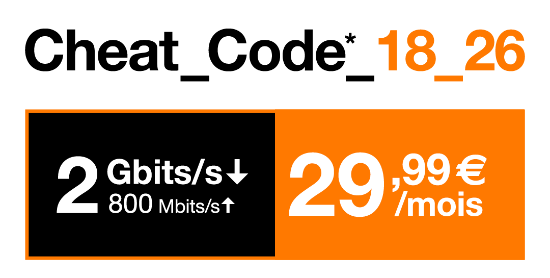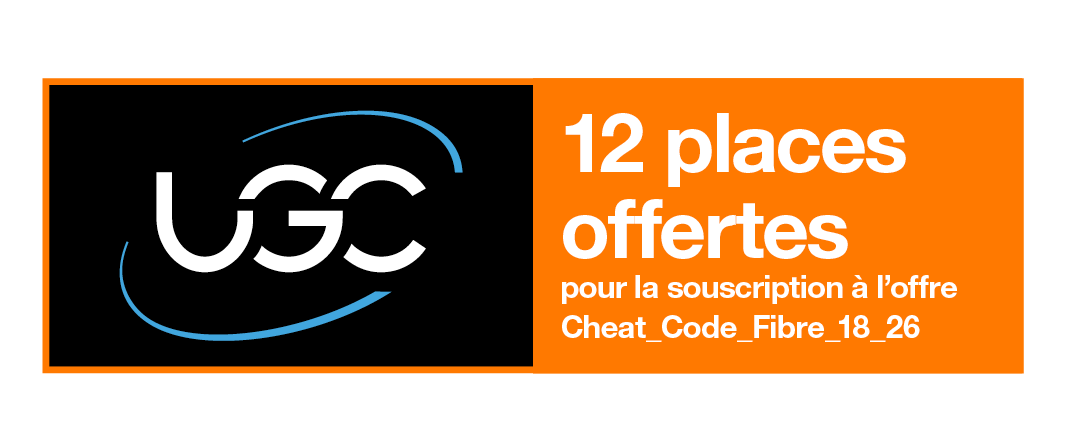 Prix valable après validation de la demande de remboursement. Offre Fibre soumise à conditions, valable à partir du 21/08/25 en France métropolitaine, sous réserve d’éligibilité pour les nouvelles souscriptions par des clients de moins de 26 ans et 6 mois, sur présentation d’une carte d’identité. Débit max théoriques avec équipements compatible. Remboursement de 20 €/mois à partir de la 2e facture Orange et jusqu’aux 26 ans révolus du client. Non cumulable. Perte du remboursement en cas de résiliation ou de changement d’offre. Détails et formulaires sur odr.orange.fr. Offre UGC valable du 21/08/25 au 28/09/25 pour toute souscription à l’offre à l’offre Cheat_Code_Fibre_18_26 exclusivement dans les boutiques Orange de Toulouse Esquirol, Toulouse Alsace Lorraine, Toulouse Gramont et Labège. Pour bénéficier de 12 places de cinéma UGC, complétez le formulaire digital (lien communiqué en boutique au moment de la souscription). Les places vous seront adressées sous format dématérialisé par mail au plus tard dans un délai de 2 mois suivant la validation du formulaire, et après acceptation de votre demande.