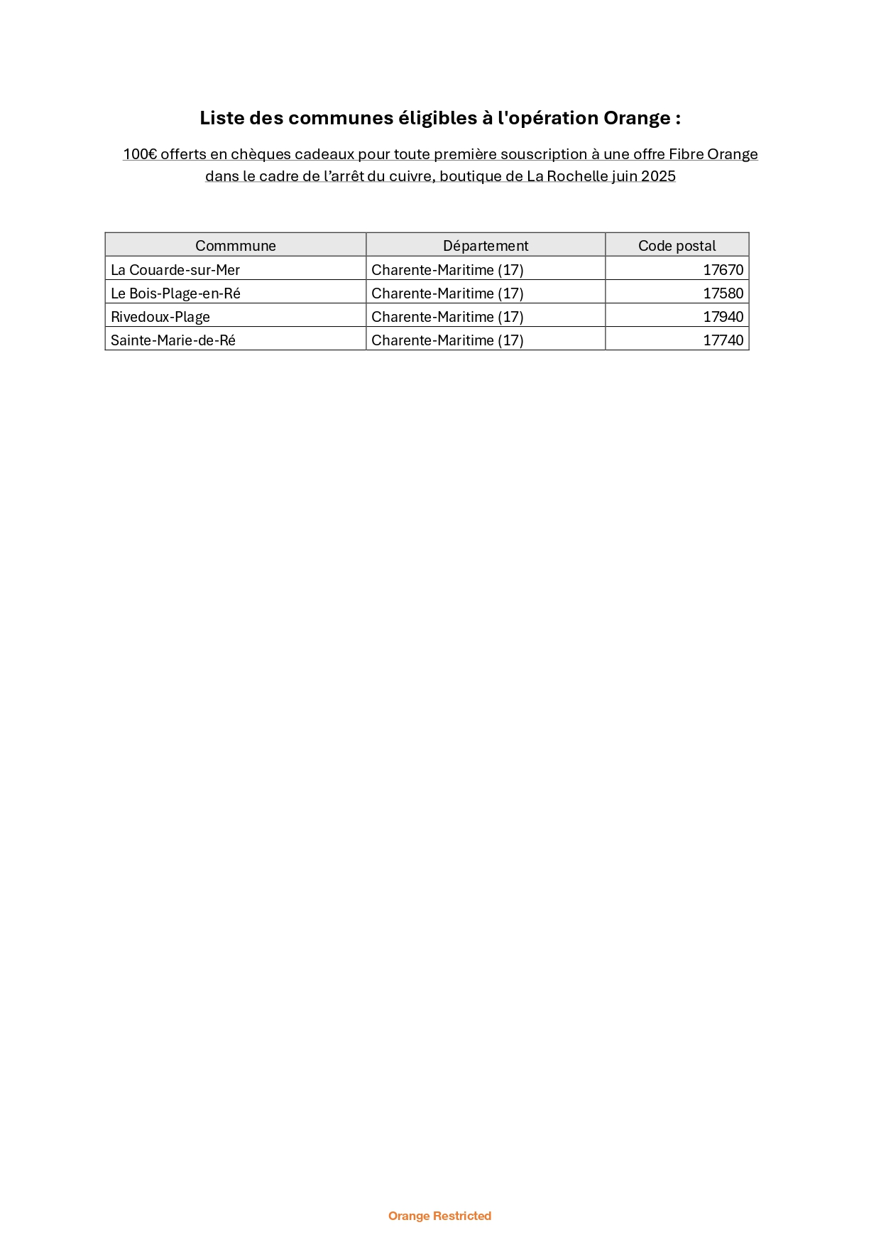(1) 100€ offerts en chèques cadeaux pour toute première souscription à la Fibre Orange entre le 15 juin et le 12 juillet 2025 réalisée dans la boutique Orange de La Rochelle (limité à un remboursement par foyer) - offre réservée aux particuliers résidant dans les communes éligibles, non cumulable avec d’autres opérations « chèques cadeaux ». Pour vérifier votre éligibilité et en bénéficier, rendez-vous sur https://formulaires.odr.orange.fr/15515 - Offre limitée aux 50 premières demandes en complétant le formulaire avant le 30 juillet 2025. Chèques Kadéos envoyés dans un délai de 4 à 6 semaines. Liste des magasins acceptant les Tickets Infini kadeos® sur www.edenred.fr/kadeos