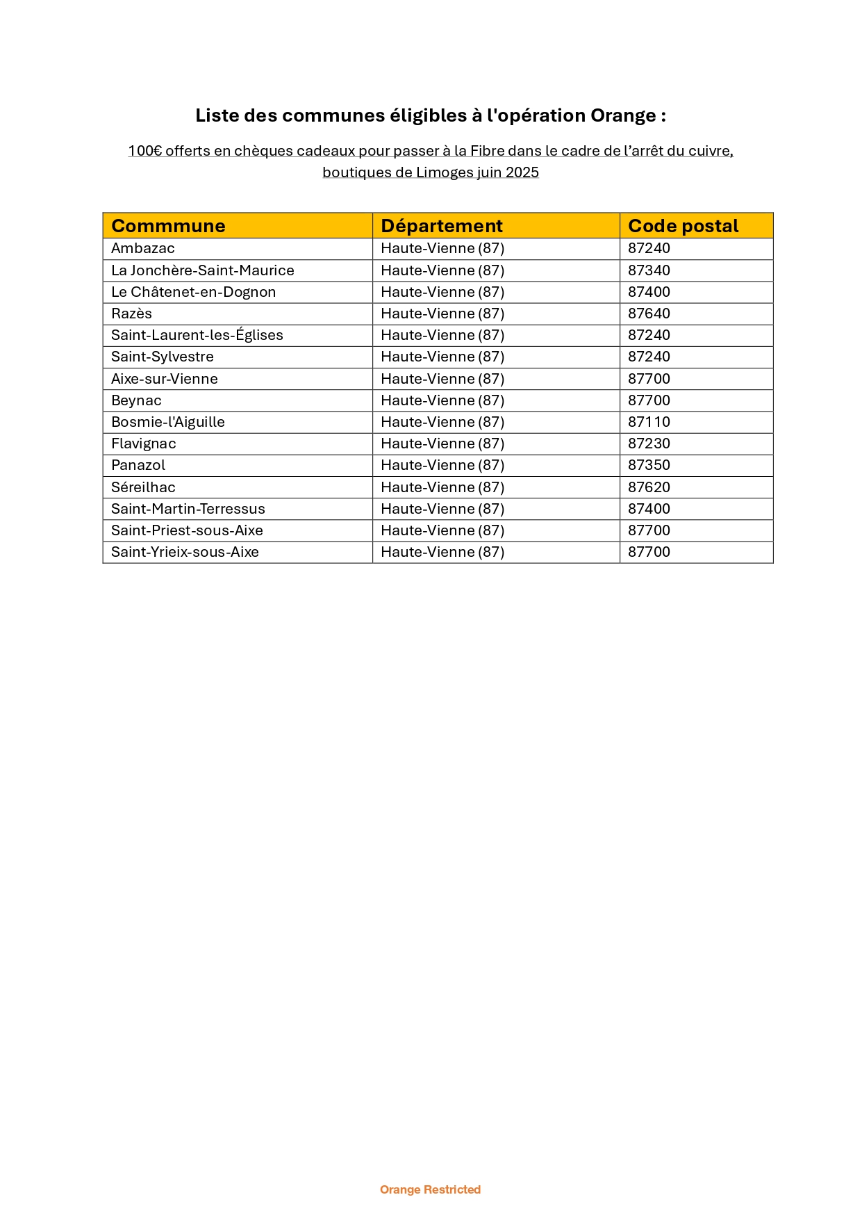(1) 100€ offerts en chèques cadeaux pour toute première souscription à la Fibre Orange entre le 15 juin et le 12 juillet 2025 réalisée dans les boutiques Orange de Limoges (limité