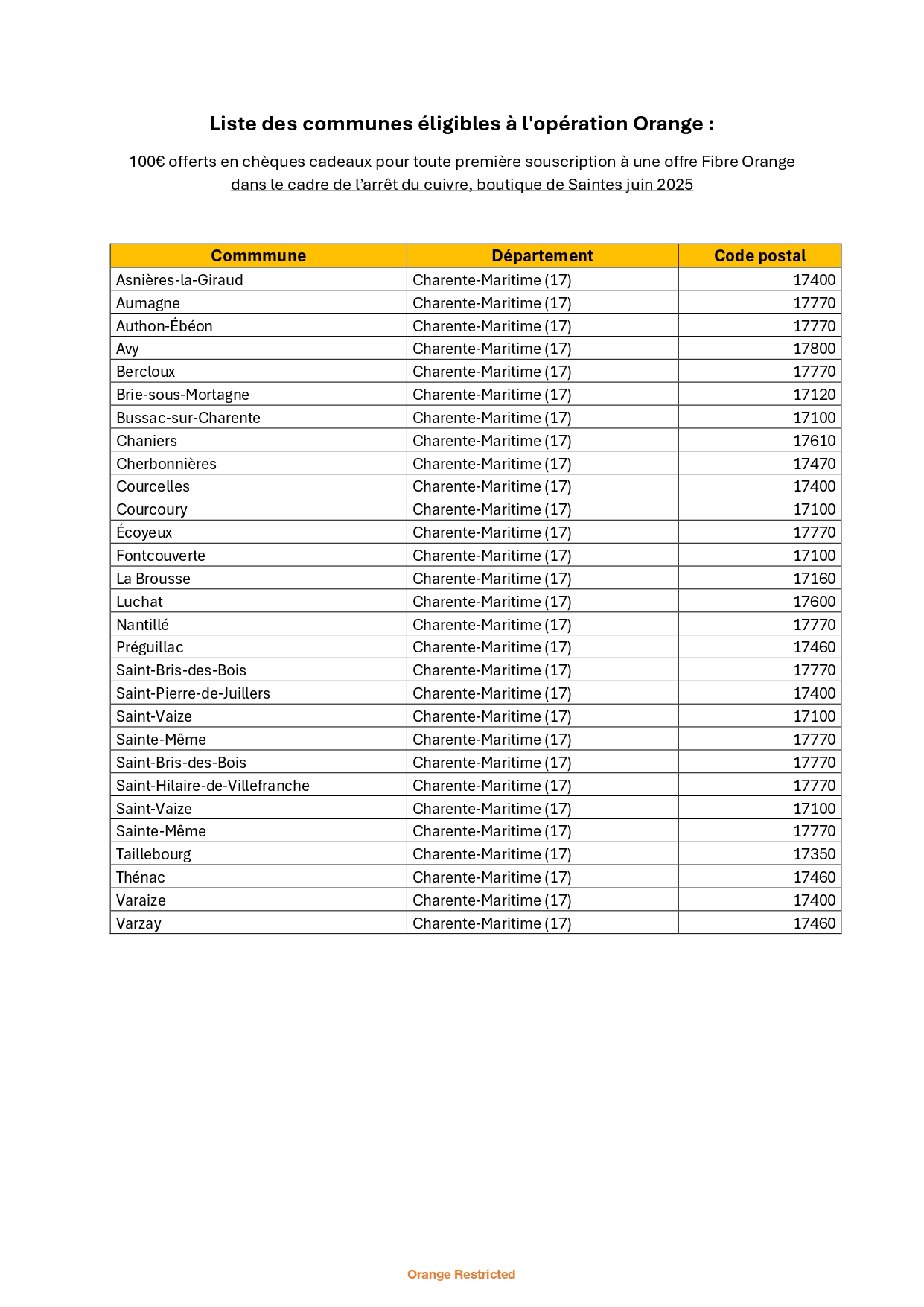 (1) 100€ offerts en chèques cadeaux pour toute première souscription à la Fibre Orange entre le 15 juin et le 12 juillet 2025 réalisée dans la boutique Orange de Saintes (limité à un remboursement par foyer) - offre réservée aux particuliers résidant dans les communes éligibles, non cumulable avec d’autres opérations « chèques cadeaux ». Pour vérifier votre éligibilité et en bénéficier, rendez-vous sur https://formulaires.odr.orange.fr/15515 - Offre limitée aux 50 premières demandes en complétant le formulaire avant le 30 juillet 2025. Chèques Kadéos envoyés dans un délai de 4 à 6 semaines. Liste des magasins acceptant les Tickets Infini kadeos® sur www.edenred.fr/kadeos.